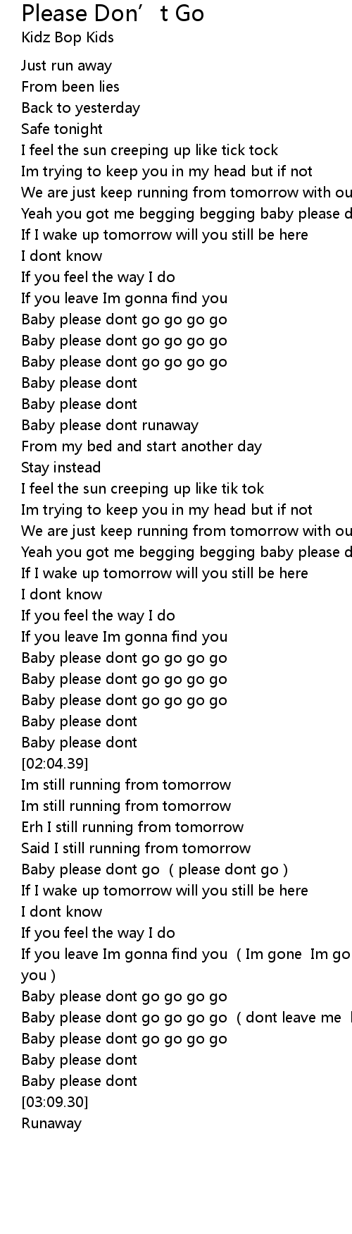 Lirik lagu please don't go yang dipopulerkan olehi mike posner. Baby i'm begging you just please don't go, so i can tell you what you need to . I was begging you, please don't go Are you suffocating under my love? I'm begging you please stay I want you to know that i'm going to miss your love the minute you walk out that door. You'll be the prince and i'll be the come Now please don't go, oh no. Begging you, please, don't go when i met you on the outskirts of town. Sekarang tolong jangan pergi, oh jangan. Layanan mobile dari situs entertainment terbesar. We'll just keep running from tomorrow with our lips locked. Yeah, you got me begging, begging.